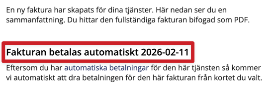 - Högt upp mot mitten av sidan kommer du se datum när vi kommer försöka dra betalningen för fakturan automatiskt.