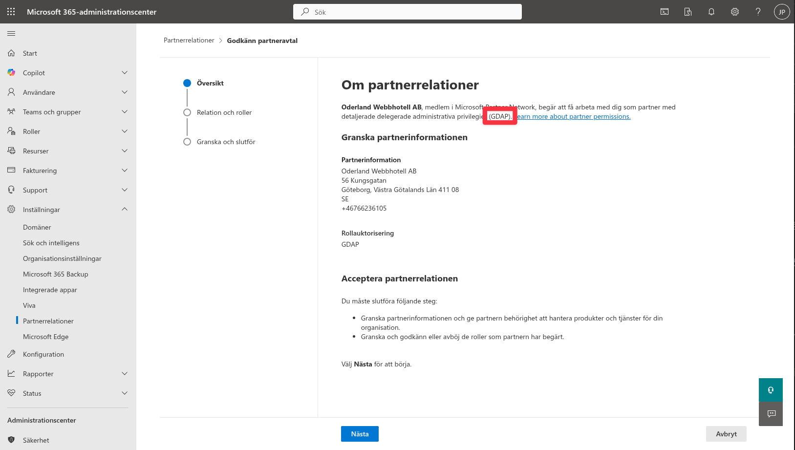 https://admin.microsoft.com/AdminPortal/Home#/partners/invitation/granularAdminRelationships/a1b2c3d4-a1b2-c3d4-e5f6-a1b2c3d4e4f6-a1b2c3d4-a1b2-c3d4-e5f6-a1b2c3d4e4f6 - På sidan du landar på, granska informationen om GDAP och klicka på