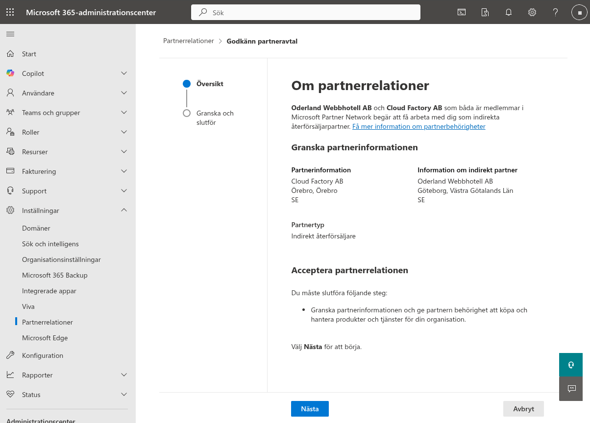 https://admin.microsoft.com/Adminportal/Home?invType=IndirectResellerRelationship&partnerId=a1b2c3d4-e5f6-a1b2-c3d4-e5f6a1b2c3d4&msppId=1231234&indirectCSPId=a1b2c3d4-e5f6-a1b2-c3d4-e5f6a1b2c3d4#/BillingAccounts/partner-invitationNär detta är klart kommer vi inom kort att skicka ytterligare två länkar som du behöver godkänna för att vi smidigt ska kunna flytta dina licenser och hjälpa dig med teknisk support.