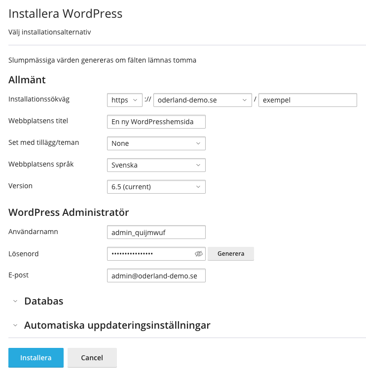 - Installationssökväg: Den URL som WordPressinstallationen ska vara tillgänglig på. Välj om du vill använda http eller https (vi rekommenderar alltid https), vilken domän sidan ska ligga på samt i vilken mapp på domänen (det går också utmärkt att lägga installationen direkt på domänen om du så önskar, lämna då textfältet tomt). I exemplet ovan kommer installationen hamna på
