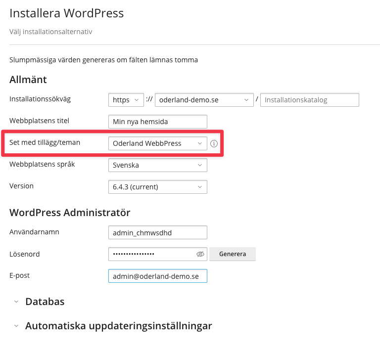 Oderland WebbPressvid Set med tillägg/teman. Detta kommer göra att alla nödvändiga plugins och teman som WebbPress utgörs av installeras automatiskt åt dig.