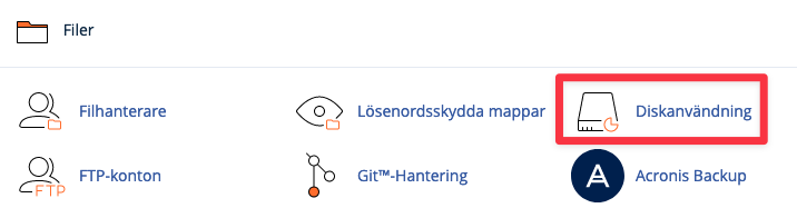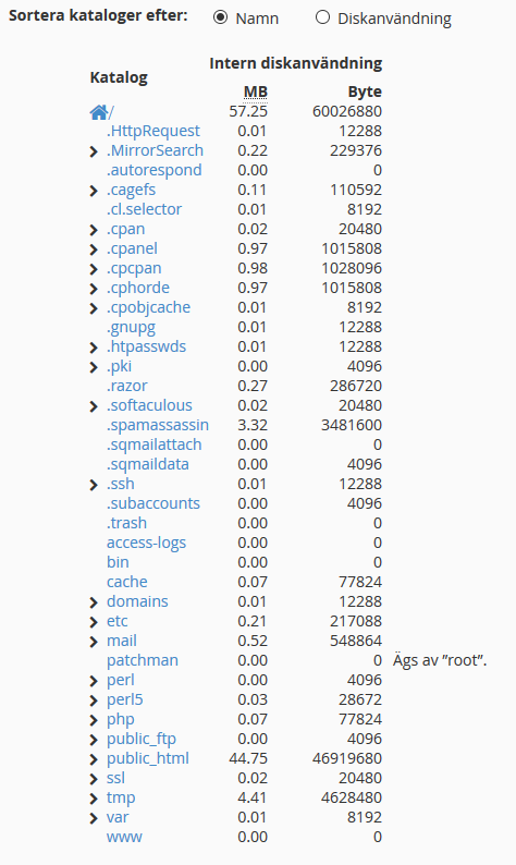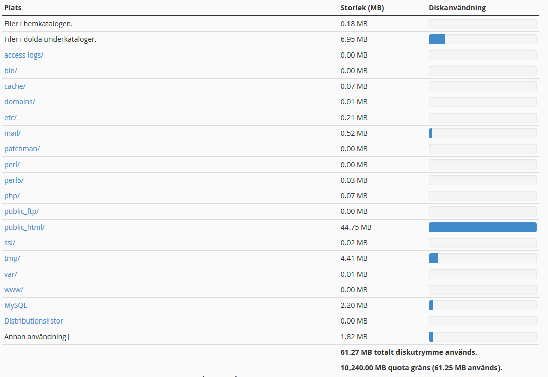 När verktyget har laddat klart kommer det högst upp på sidan finnas en lista med alla mappar i hemmappen för ditt webbhotellkonto samt hur mycket utrymme alla filerna i dom mapparna använder. Det är en första ledtråd till vad det är som använder mest diskutrymme. T.ex. om du ser att mappen mail tar upp mest utrymme så är det dina mailkonton som använder majoriteten av ditt diskutrymme. Om det däremot är public_html-mappen är det troligtvis någon av dina hemsidor som använder mest utrymme.