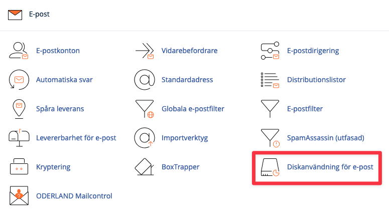 Om det visar sig att mail tar upp mest utrymme på ditt webbhotellkonto så finns det ett praktiskt verktyg du kan använda för att rensa ut gamla mail. För att nå detta verktyg klickar du på ikonen Diskanvändning för e-post på cPanels startsida.