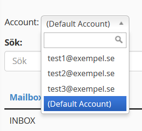 Du kommer först se ditt standardkonto. Alla webbhotellkonton har ett standardkonto för mail, dock innehåller det för det mesta inga mail. Om du har skapat egna mailkonton så kan du högst upp i den drop-down-meny som heter Account/Konto välja vilket mailkonto du vill hantera.
