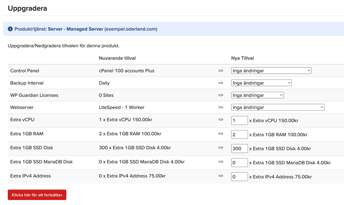 När du är inne på Kundavdelningen beställer du upp- eller nedgradering av din servers systemresurser så här: