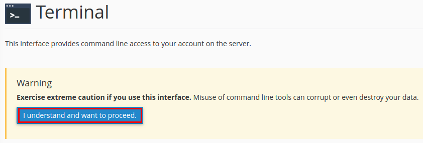 - A warning will appear on the next page if you have not used the terminal before. If you are comfortable using a terminal and want to go ahead, click the blue button.