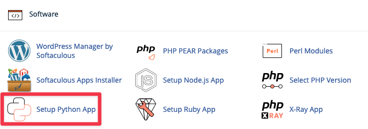To set up a new Python application, begin by logging on to cPanel. Then, find the section Software and click the icon Setup Python App.