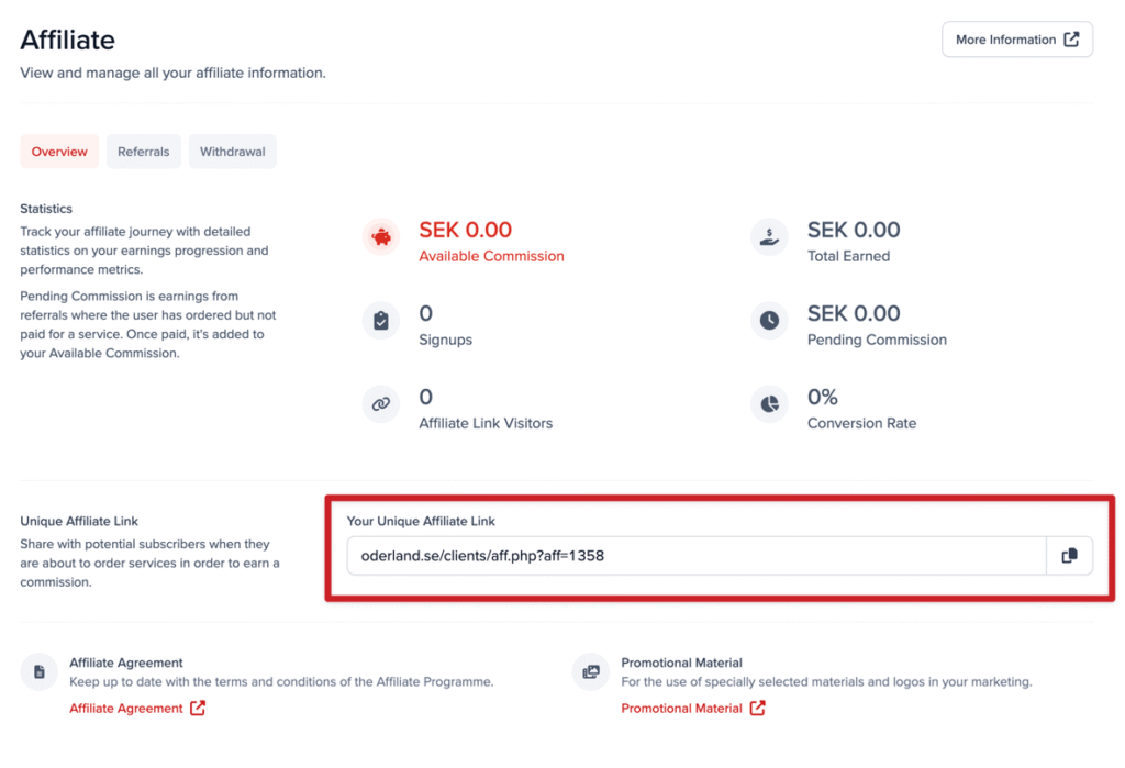 To collect commissions, be sure to share your unique affiliate link (see below) with everyone you want to tell about us. Every time someone places an order with us after surfing to our website via your link, the order will be linked to your partner account with us and you can start receiving kickback on invoices paid by the customer (not applicable to start-up fees, domain names, Oderland Cloud, Microsoft 365 licenses, or upgrade orders).